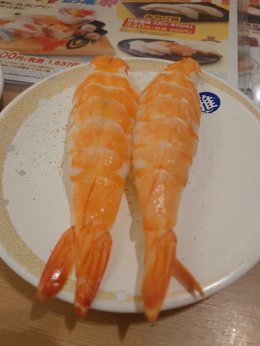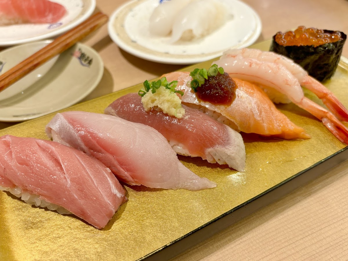 The restaurant offers a variety of fresh and delicious sushi dishes, with some highlights that will surely satisfy any sushi lover. One of the standout dishes is the オーロラサーモンとろ炙り, a perfectly seared salmon with a smooth, melt-in-your-mouth texture. It pairs wonderfully with their まぐろ5貫 (five pieces of tuna), showcasing the best of what this restaurant has to offer. If you’re in the mood for something a bit different, the 海老3貫 (three pieces of shrimp) is another favorite, delivering that fresh, sweet taste of the sea that’s hard to resist. The sushi is served on a conveyor belt, so you can pick your favorites as they come around, giving you a variety of options without any pressure.